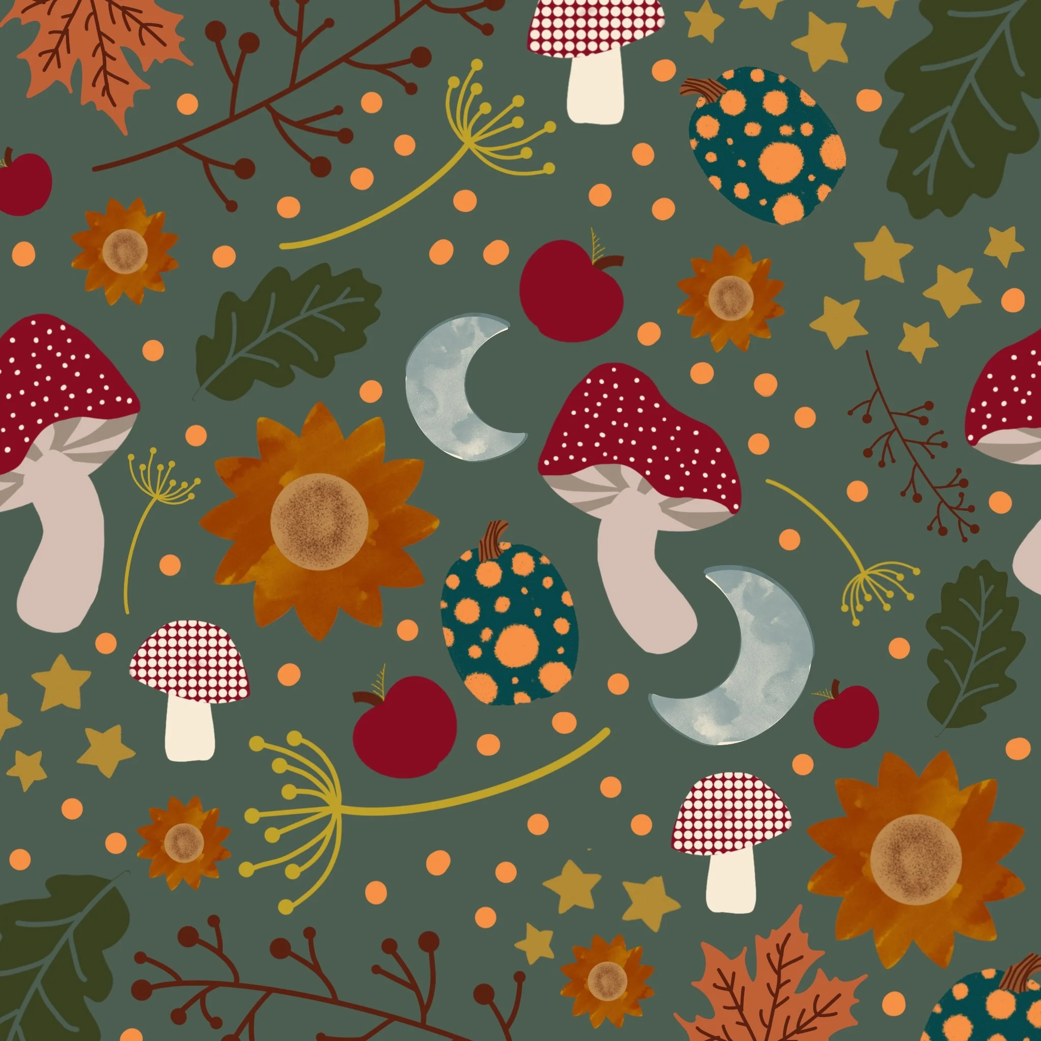 Pattern with mushrooms, sunflowers, apples, pumpkins, moon phases, stars, and autumn leaves on a green background.