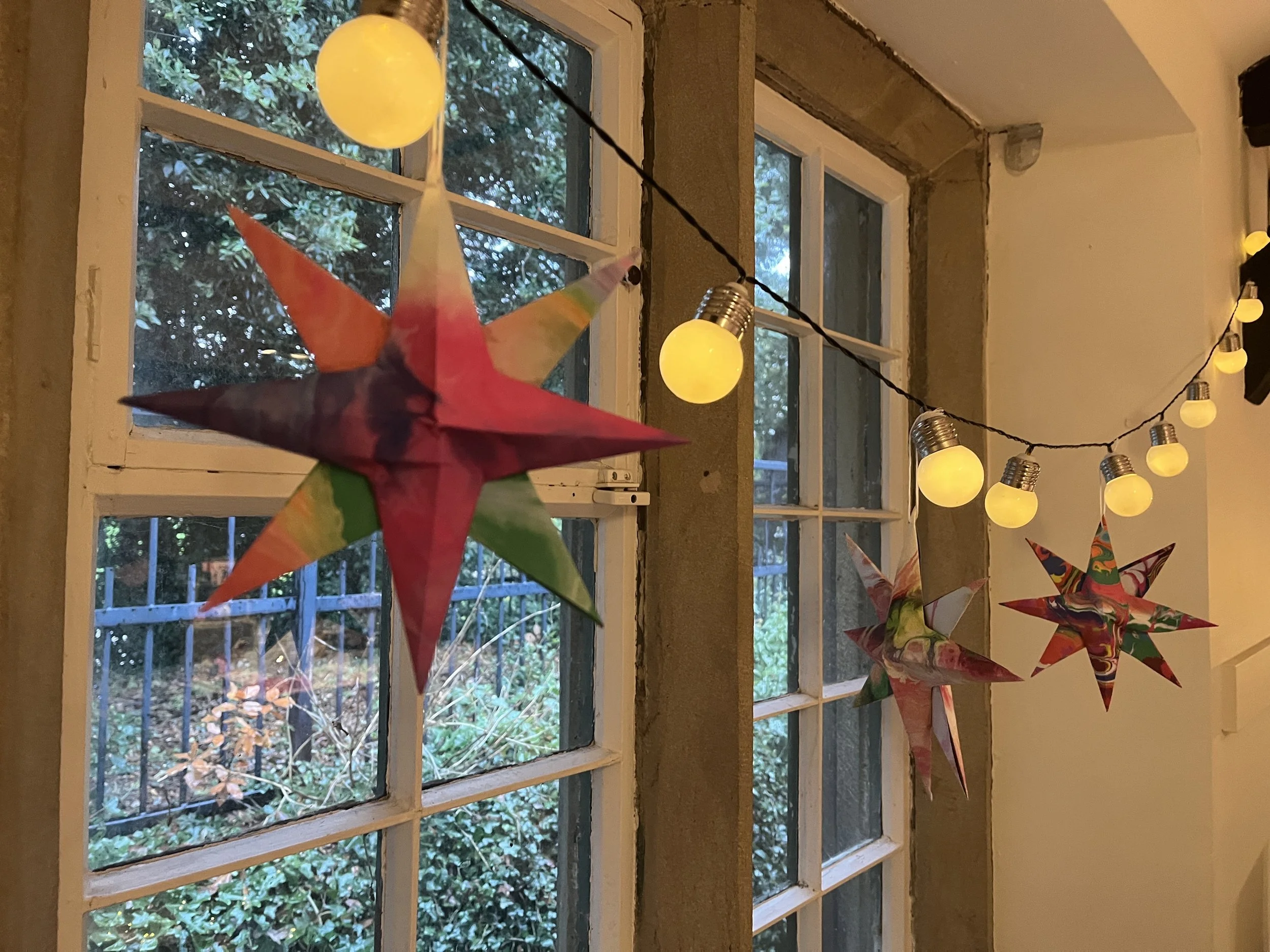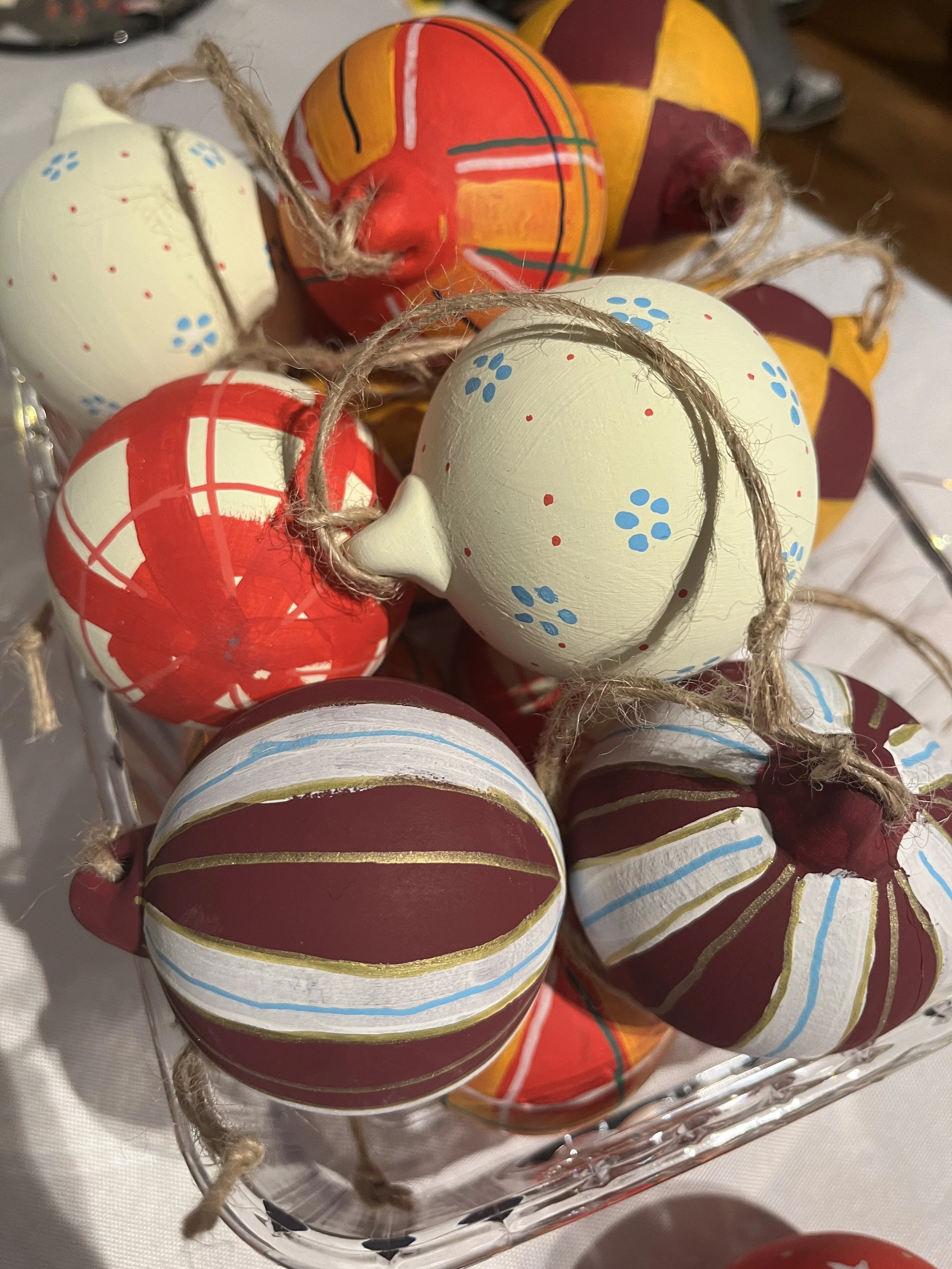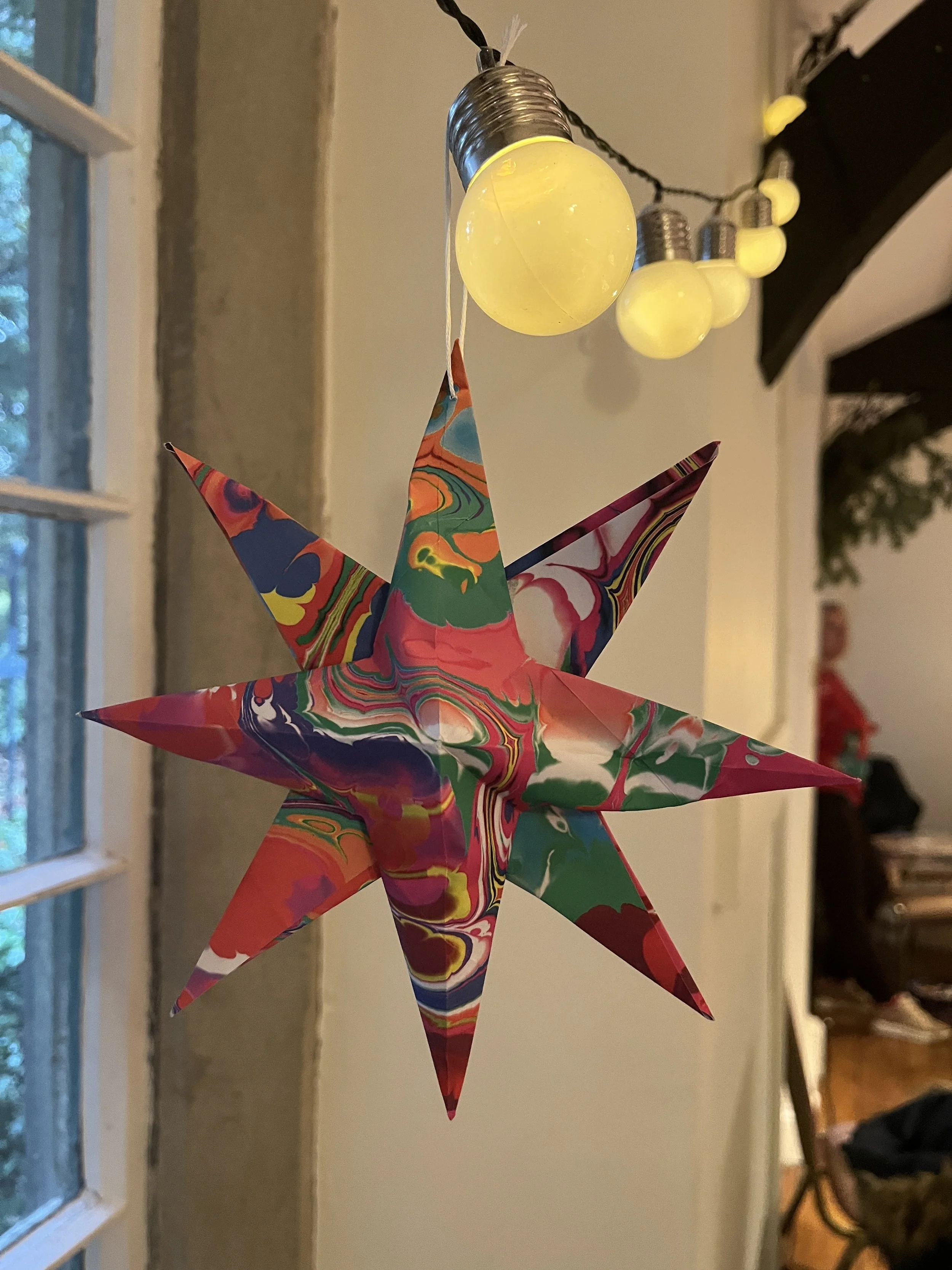 Decorative butterfly-shaped paper ornament with yellow wings and orange spots, hanging on a string outdoors with green trees and a blue sky in the background.