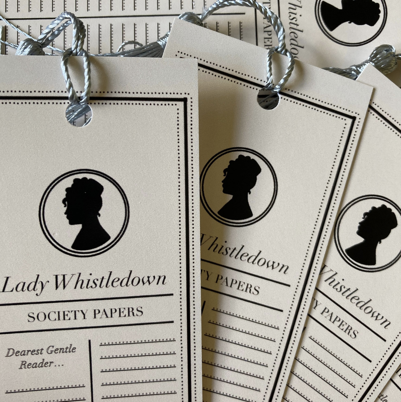 Lady Whistledown bookmarks with a silhouetted profile of a woman, titled "Lady Whistledown Society Papers," decorated with dotted and double-line borders, and featuring lined spaces for writing messages.