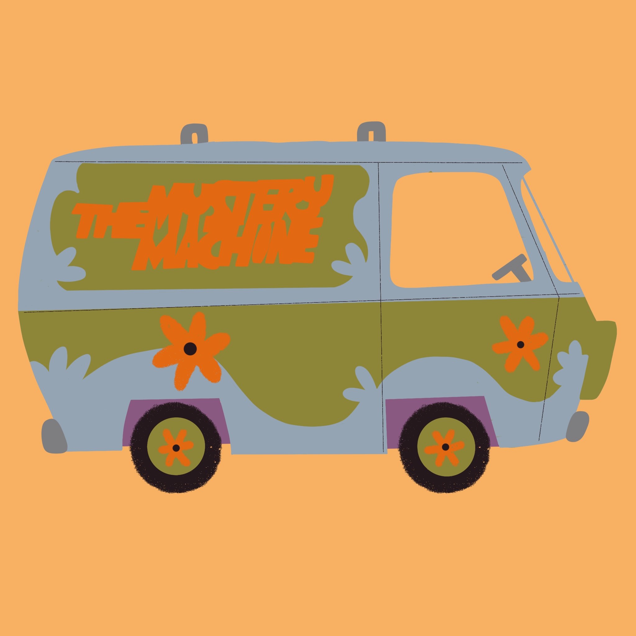 A colorful illustration of a vintage-style van with a hippie aesthetic, featuring flowers and the words 'The Mothership' on the side, set against an orange background.