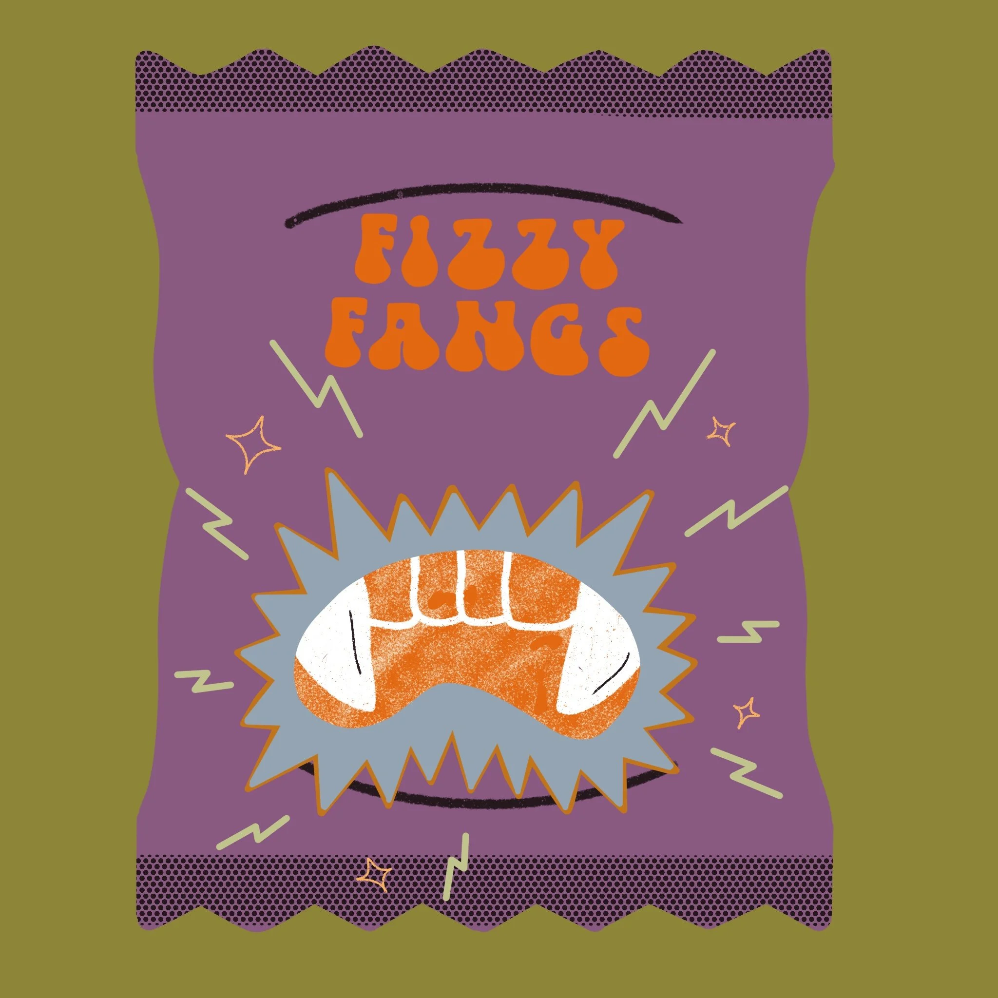 A colorful illustrated snack bag labeled "Fizzy Fangs" with a cartoon depiction of a vampire fangs surrounded by comic-style bursts and sparkles, set against an olive green background.