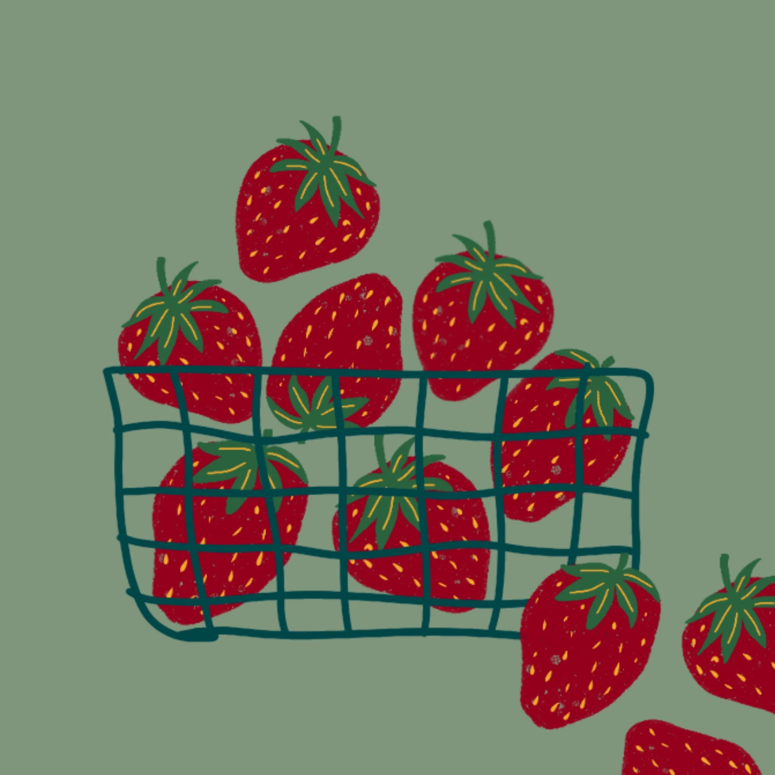 Illustration of a wire basket filled with red strawberries, some of which are falling out onto a green background.