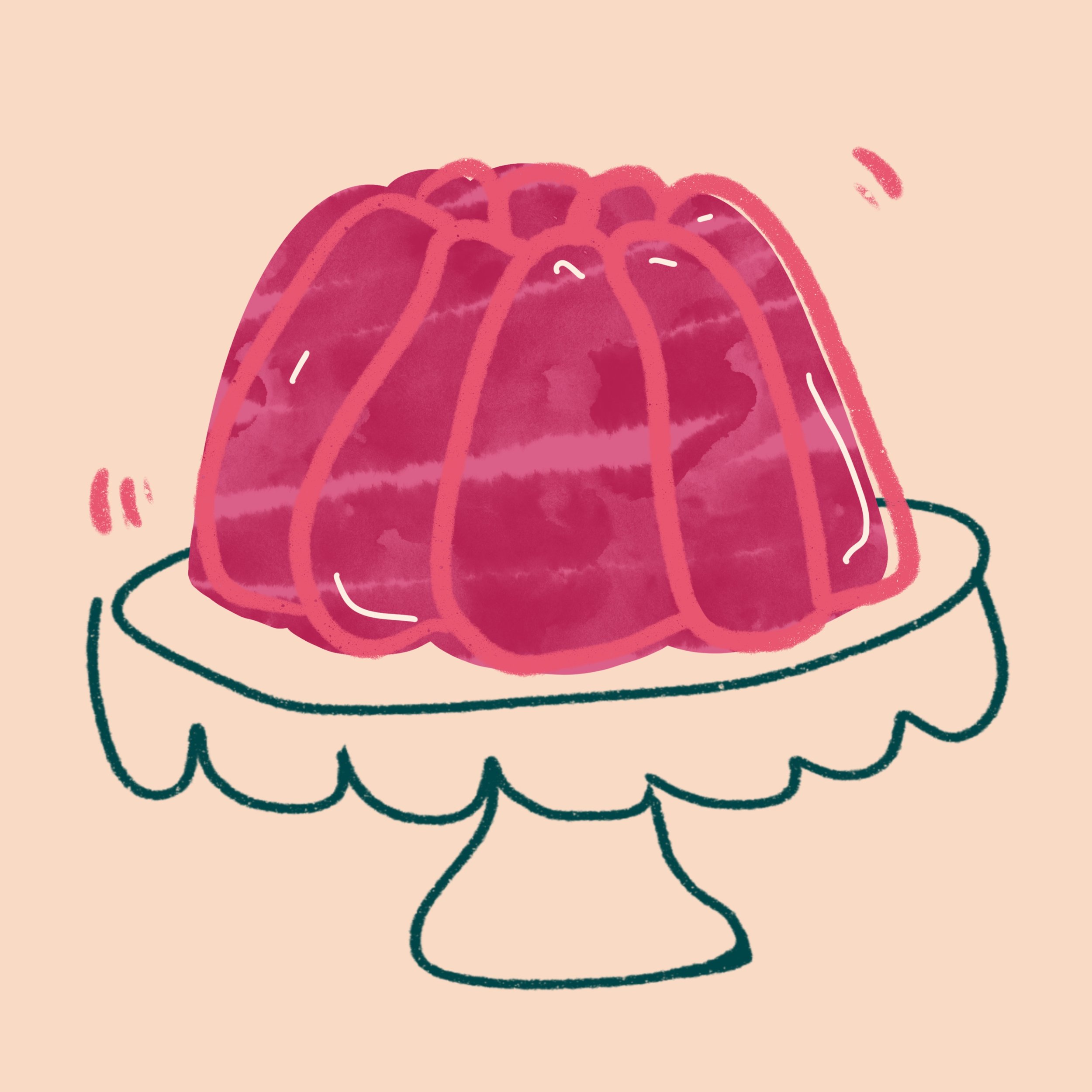 Illustration of a cake stand with a wobbly jelly on top, rendered in a sketchy style with pink and red colors.